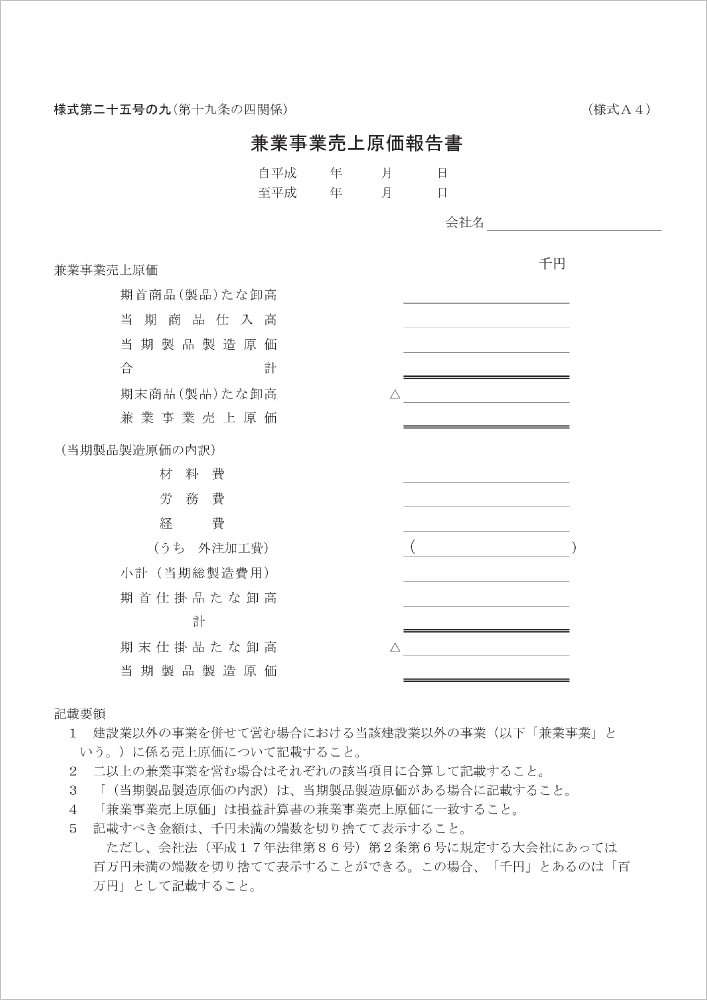 建設業以外の事業を併せて営んでいる場合は、当該事業(兼業事業)の売上原価について、下記の様式の「兼業事業売上原価報告書」を作成します。