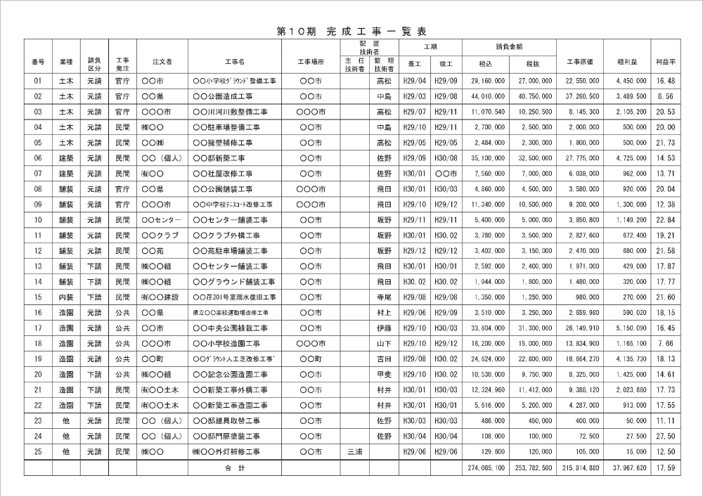 よって、工事1件1件の正確な請負金額は確実に把握しておかなければならないのですが、下記のような「完成工事一覧表」を作成し、様式第二号の記載要領に従って、あらかじめ工事経歴をまとめておくと良いでしょう。