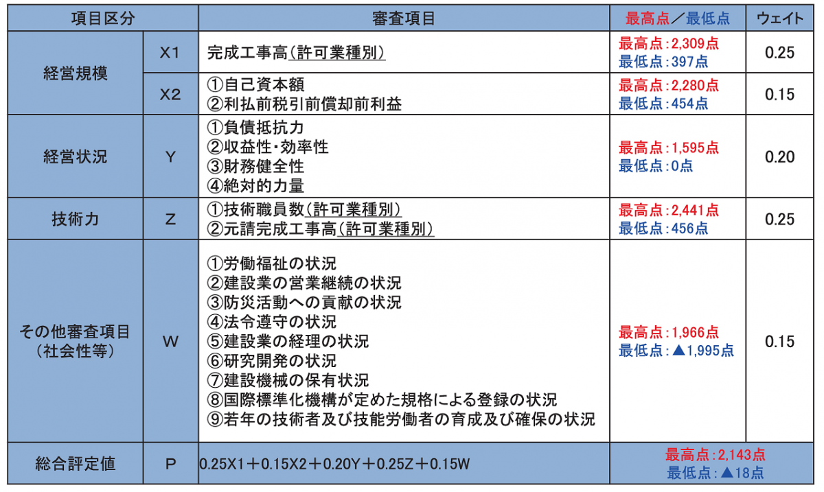 経審の総合評定値(P点)は、次の5つの評点を要素として成り立っています。