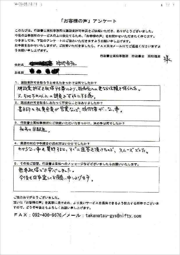 福岡の建設業許可 最短4日で申請!! 建設業許可申請サポート福岡 行政書士高松事務所(行政書士 高松 隆史) 〒810-0024 福岡市中央区桜坂3丁目12番92号 |