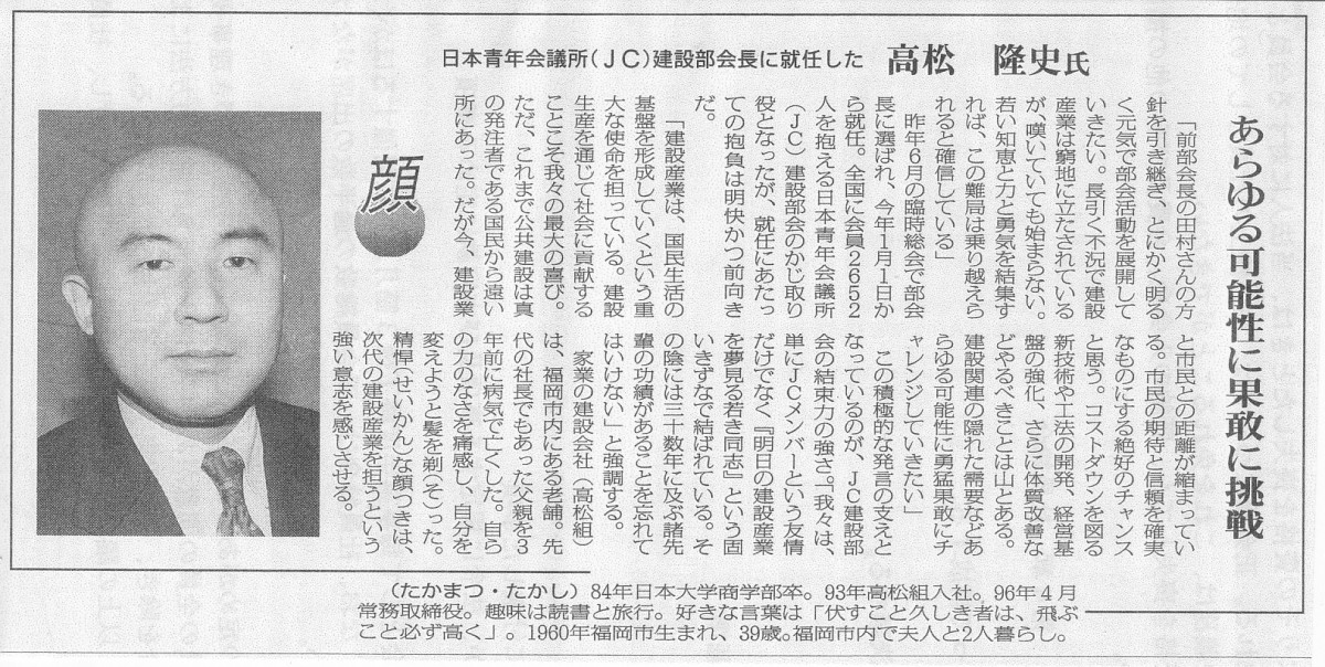 建設部会の年次は一月から十二月まで。つまりちょうど二〇〇〇年一年間を建設部会長として会員をけん引することに。(後略)