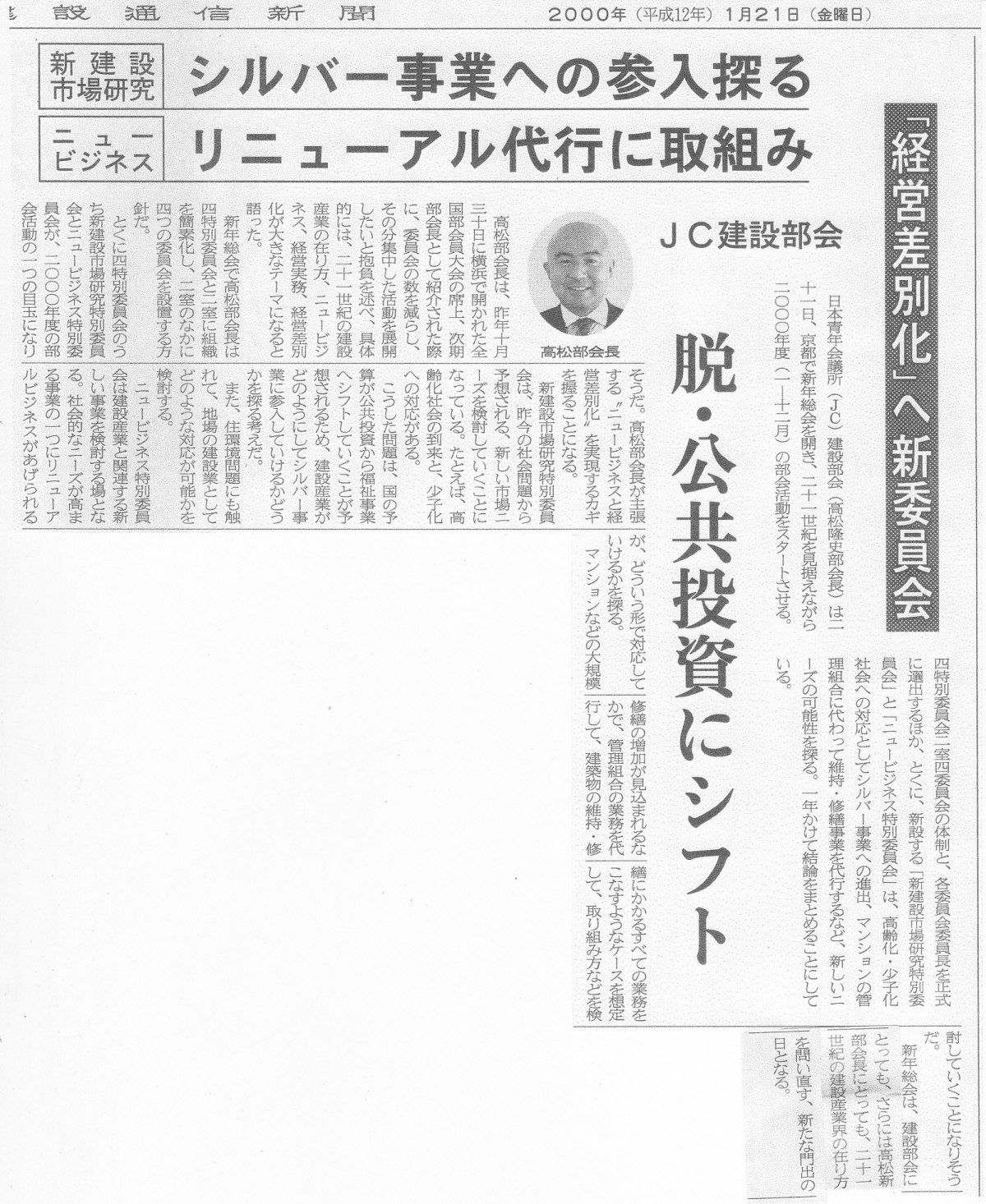 日本青年会議所(JC)建設部会(高松隆史部会長)は二十一日、京都で新年総会を開き、二十一世紀を見据えながら二〇〇〇年度(一月~十二月)の部会活動をスタートさせる。四特別委員会二室四委員会の体制と、各委員会委員長を正式に選出するほか、とくに、新設する「新建設市場研究特別委員会」と「ニュービジネス特別委員会」は、高齢化・少子化社会への対応としてシルバー事業への進出、マンションの管理組合に代わって維持・修繕事業を代行するなど、新しいニーズの可能性を探る。一年かけて結論をまとめることにしている。(後略)