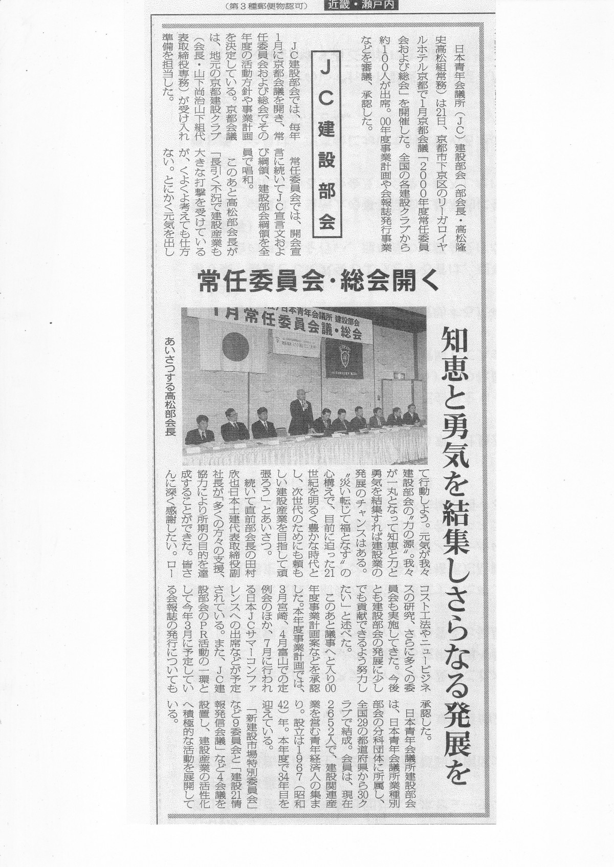 日本青年会議所(JC)建設部会(部会長・高松隆史)は21日、京都市左京区のリーガロイヤルホテル京都で1月京都会議「2000年度常任委員会および総会」を開催した。全国の各建設クラブから約100人が出席。00年度事業計画や会報誌発行事業などを審議、承認した。JC建設部会では、毎年1月に京都会議を開き、常任委員会および総会でその年度の活動方針や事業計画を決定している。京都会議は、地元の京都建設クラブが受け入れ準備を担当した。状に荷員会では、開会宣言に続いてJC宣言文および綱領、建設部会綱領を全員で唱和。このあと高松部会長が「長引く不況で建設産業も大きな打撃を受けているが、くよくよ考えても仕方ない。とにかく元気を出して行動しよう。元気が我々建設部会の“力の源”。我々が一丸となって知恵と力と勇気を結集すれば建設業の発展のチャンスはある。“災い転じて福となす”の心構えで、目前に迫った21世紀を明るく豊かな時代とし、次世代のためにも頼もしい建設産業を目指して頑張ろう」とあいさつ。(後略)