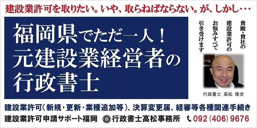 行政書士高松事務所 〒810-0024 電話番号:092-406-9676 営業時間:午前9時~午後6時(土曜12時) | 建設業許可の信頼できる専門家 福岡県の建設業許可申請代行はお任せください お急ぎのときは 090-8830-2060 |